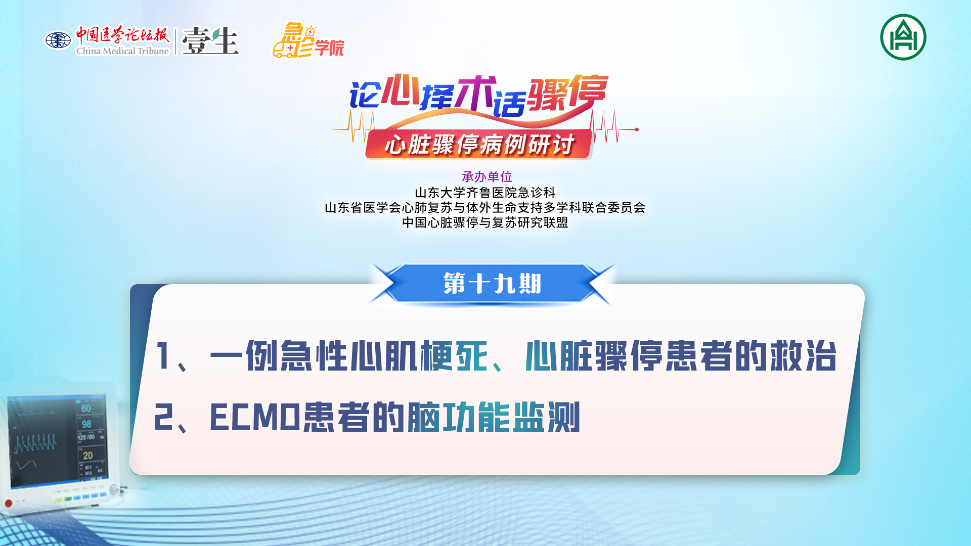栏目介绍中国医学论坛报·壹生急诊学院特别邀请山东大学齐鲁医院、山东省医学会心肺复苏与体外生命支持多学科联合委员会策划了《论心择术,话骤停——心脏骤停病例研讨》栏目。栏目每期邀请具有丰富临床经验的、来自全国的专家,分享心脏骤停病例,探讨热点话题,解读前沿理论,旨在聚焦临床实践、分享救治心得、普及先进理念、提升规范化诊疗水平、促进全国复苏中心建设,推动医护人员心脏骤停救治的技术提高和质量改进,从而切实造福患者。欢迎关注~第十九期1、一例急性心肌梗死、心脏骤停患者的救治 2、ECMO患者的脑功能监测上线时间3月19日(周四)承办单位山东大学齐鲁医院急诊科山东省医学会心肺复苏与体外生命支持多学科联合委员会策划指导陈玉国 教授 山东大学齐鲁医院院长徐峰 教授 山东大学齐鲁医院副院长学术报告刁孟元 教授西湖大学医学院附属杭州市第一人民医院重症医学科