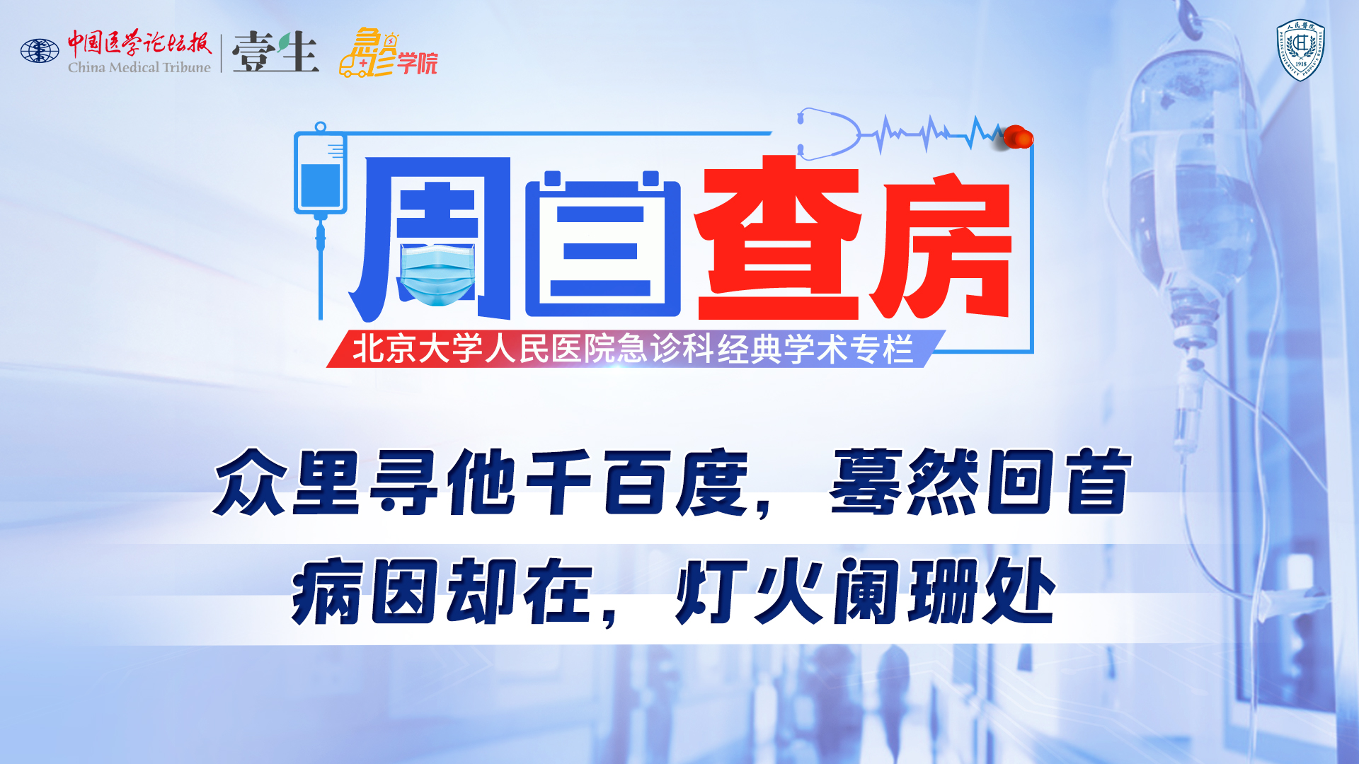 栏目介绍北京大学人民医院急诊科经典学术活动《周三查房》,自2020年11月起入驻中国医学论坛报·壹生急诊学院,经典病例结合急诊科核心知识点讲解,全部免费开放,供临床同道交流学习。更多内容,请安装壹生App,关注“急诊”频道。课程信息讲题:众里寻他千百度,蓦然回首,病因却在,灯火阑珊处讲者:高培良 医生讨论专家:宋小静,石茂静等上线时间:3月25日(周三)温馨提示:微信搜索“壹生急诊学院”,关注后免费获得上课提醒,精彩内容不错过。