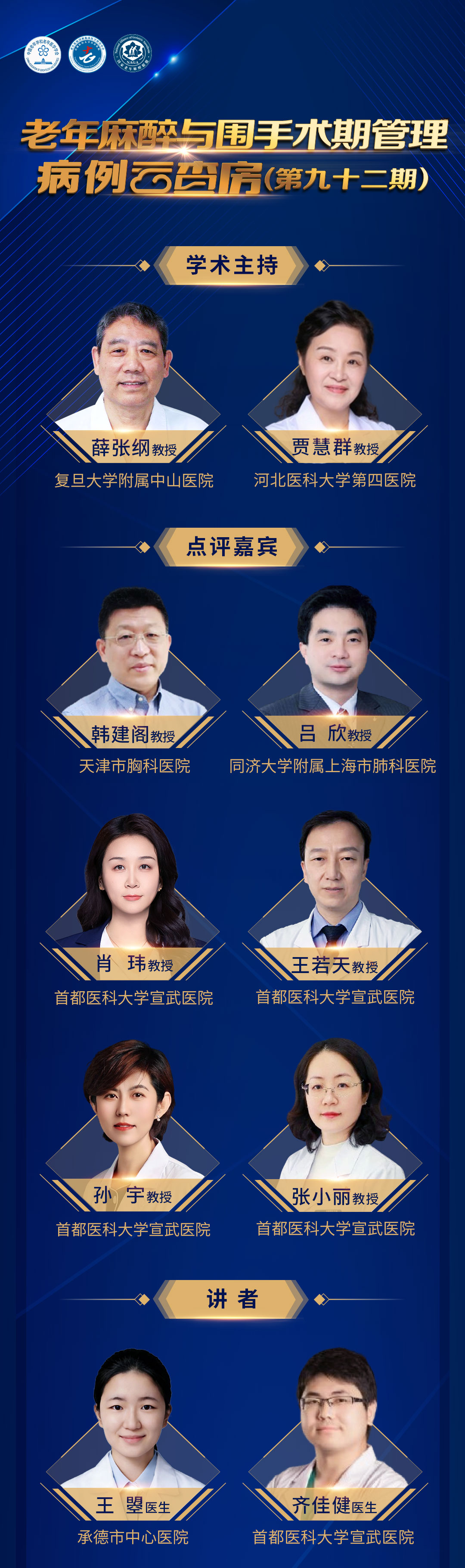 【老年患者麻醉与围手术期管理病例云查房】由中国老年学和老年医学学会、中国老年学和老年医学学会脑疾病分会、国家老年疾病临床医学研究中心(宣武医院)和国家老年麻醉联盟(NAGA)共同主办。