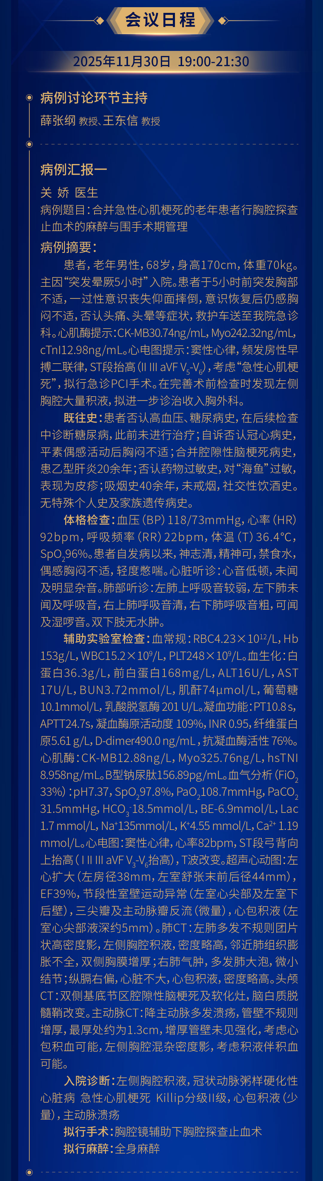 1.合并急性心肌梗死的老年患者行胸腔探查止血术的麻醉与围手术期管理