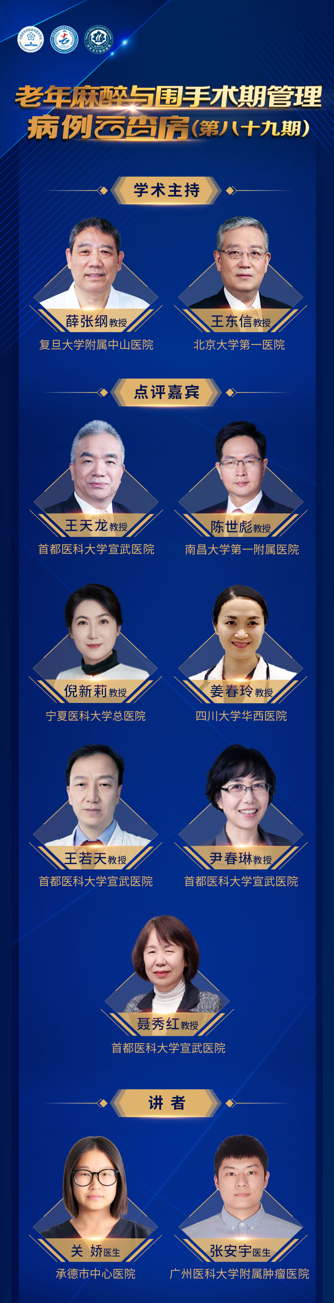 【老年患者麻醉与围术期管理病例云查房】由中国老年学和老年医学学会、中国老年学和老年医学学会脑疾病分会、国家老年疾病临床医学研究中心(宣武医院)和国家老年麻醉联盟(NAGA)共同主办。