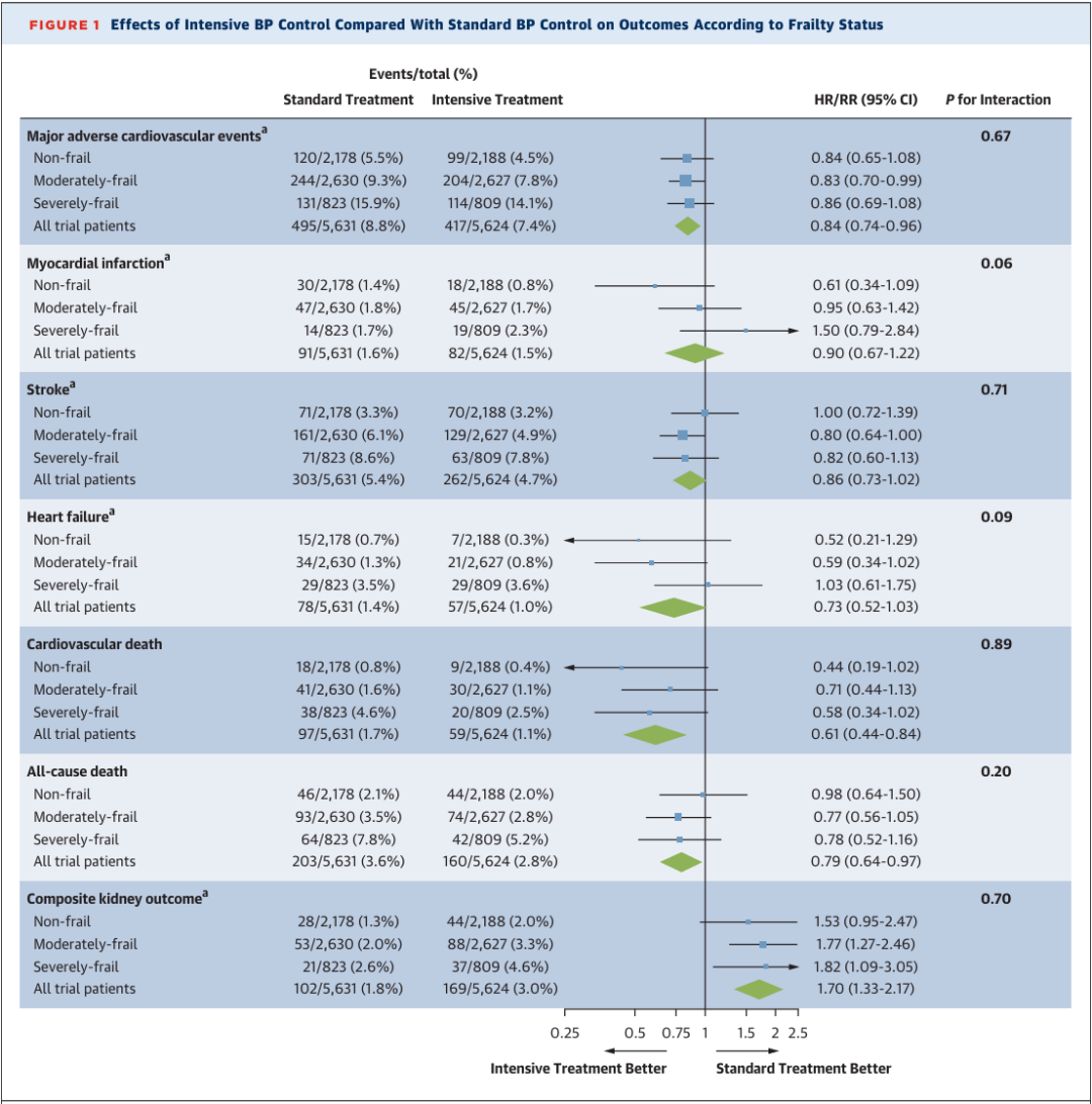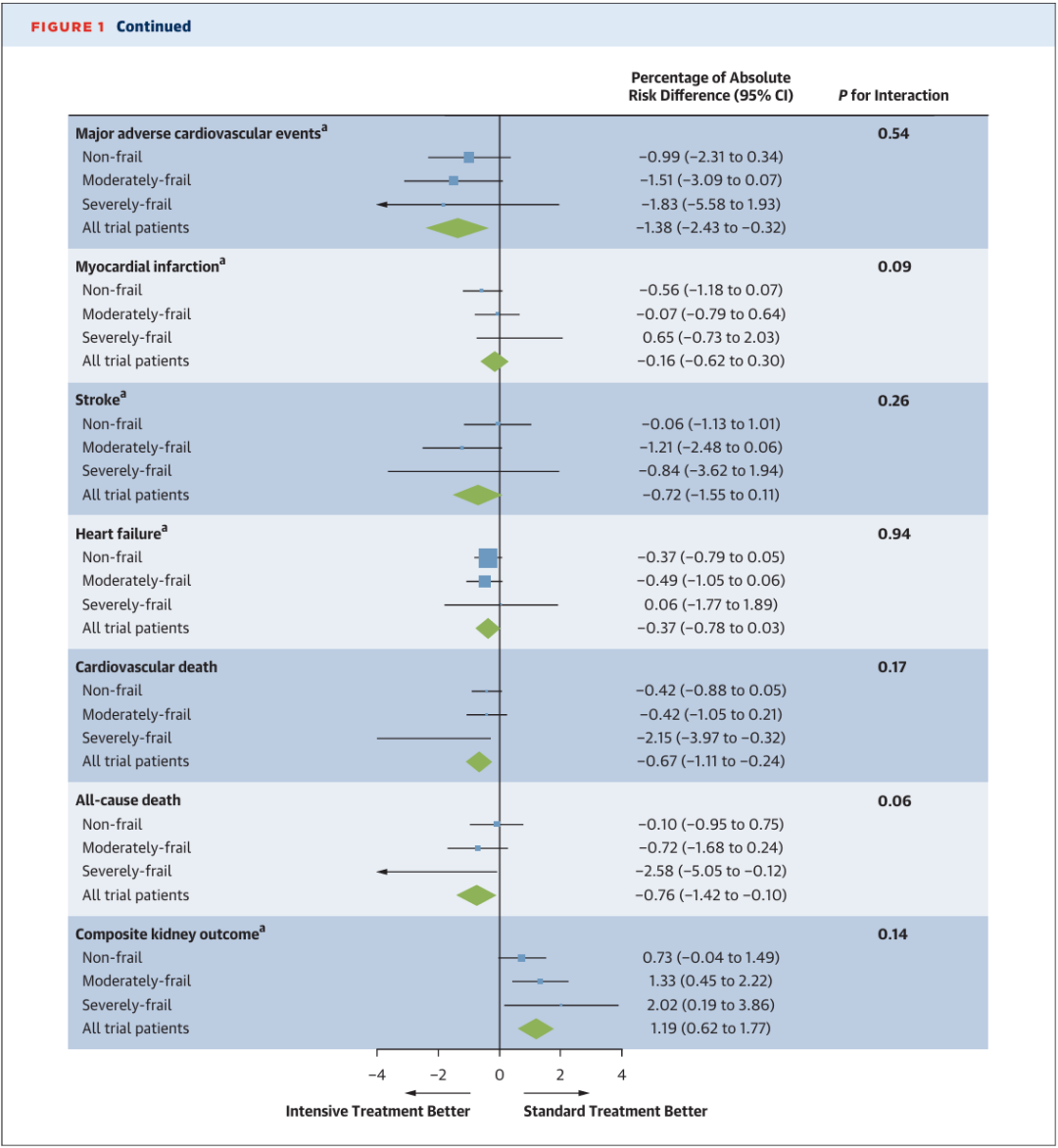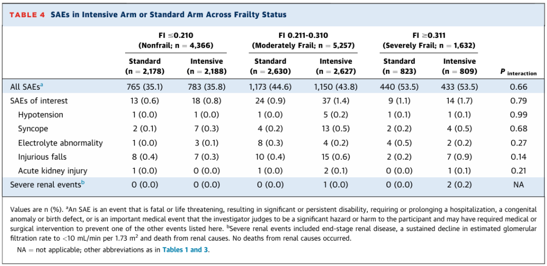 无论虚弱程度如何,强化降压治疗预防主要不良心血管事件(MACE)和全因死亡的作用是一致的。随着虚弱程度的增加,绝对获益幅度有增大的倾向,但交互作用均无统计学意义。