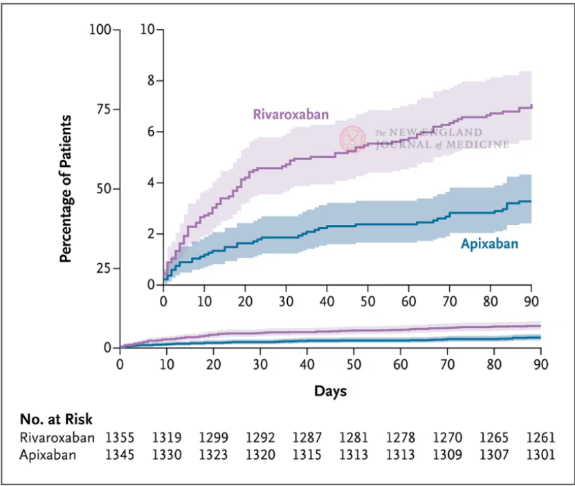 此外,接受阿哌沙班治疗的患者中有36例(2.7%)发生了与出血或静脉血栓无关的严重不良事件,而接受利伐沙班治疗的患者中有30例(2.2%)。