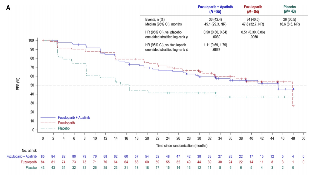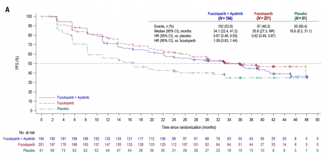 研究纳入对一线铂类化疗有应答的新诊断晚期卵巢癌患者,按2:2:1比例随机分配至氟唑帕利(100 mg bid)联合阿帕替尼(375 mg qd)组、氟唑帕利(150 mg bid)联合安慰剂组或双安慰剂治疗组。主要研究终点为盲态独立评审委员会评估的PFS期。