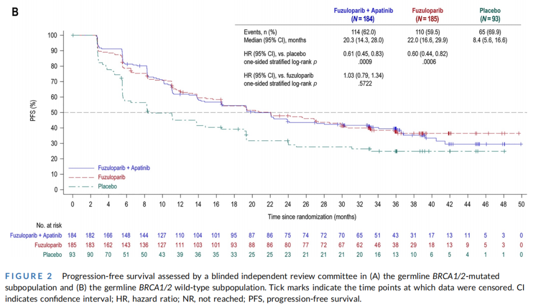 共674例患者被随机分配至联合治疗组(269例)、氟唑帕利单药组(269例)或安慰剂组(136例)。截至最终分析时(2024年11月1日;共记录385例BIRC评估的PFS事件;中位随访时间40个月),BIRC评估的中位PFS时间显示:联合治疗组对比安慰剂组为26.9个月对11.1个月(风险比0.57,95%CI 0.44~0.75,单侧P<0.0001);氟唑帕利单药组对比安慰剂组为29.9个月对11.1个月(HR 0.58,95%CI 0.44~0.75,单侧P<0.0001)。无论胚系BRCA1/2突变状态如何,均观察到PFS获益。