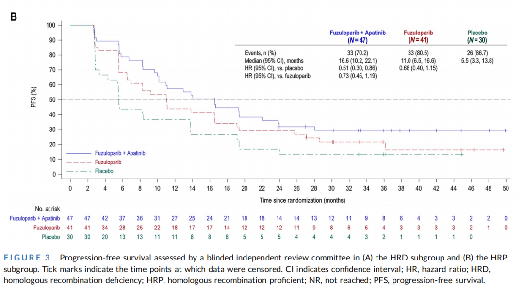 在HRD患者(包括BRCA1/2突变患者)中,氟唑帕利联合阿帕替尼与氟唑帕利单药的PFS结果相近(分别为34.1个月对比35.8个月);而在HRP患者中,联合治疗组显示出更优的PFS趋势(16.6个月对比11.0个月;HR 0.73,95%CI 0.45~1.19)。两种治疗方案均表现出良好耐受性,总生存期数据尚未成熟。