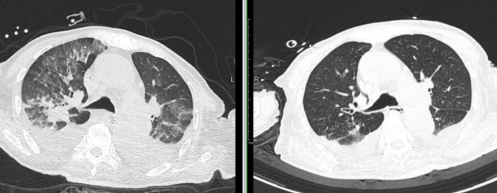 图一 患者肺部 CT:左 8 月 4 日,右 8 月 27 日
