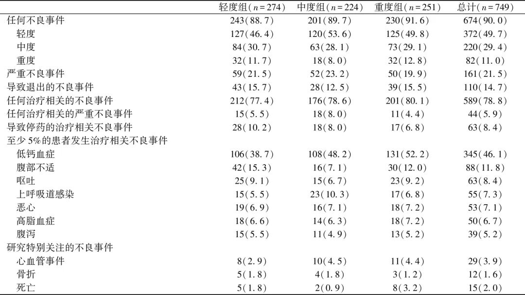 心血管事件、骨折及死亡不良事件发生率在各组间差异无统计学意义。然而,中度和重度患者报告心血管事件的比例较高,重度患者死亡事件发生率最高。死亡原因包括心血管事件(5例)、脑出血(4例)、感染(2例)、恶病质(1例)、氮质血症(1例)、猝死(1例)、意外死亡(1例),均不考虑与研究药物相关。