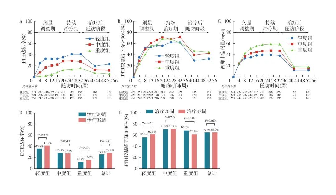 iPTH:全段甲状旁腺激素。A:研究期间iPTH达标率;B:研究期间iPTH较基线降低≥30%的比例;C:研究期间西那卡塞的平均剂量(包括停止服用西那卡塞但继续随访的患者);D:治疗20周和32周时的iPTH达标率;E:治疗20周和32周达到iPTH较基线降低≥30%的比例