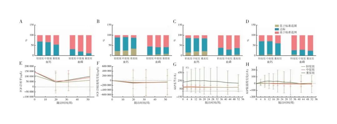 ALP:碱性磷酸酶;FGF-23:成纤维细胞生长因子23;A:基线时钙磷达标情况;B:第20周钙磷达标情况;C:第32周钙磷达标情况;D:第52周钙磷达标情况;E:研究期间FGF-23水平的变化;F:研究期间FGF-23水平相对于基线的变化;G:研究期间ALP水平的变化;H:研究期间ALP水平相对于基线的变化