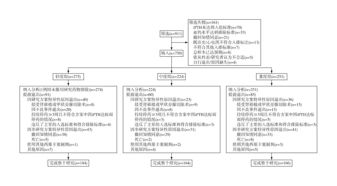 基线资料 本研究共筛选911例患者,其中750例参加了研究,包括275例(36.7%)轻度、224例(29.9%)中度和251例(33.4%)重度SHPT患者。612/750(81.6%)例受试者完成了至少20周的治疗,577/750(76.9%)例受试者完成了32周的治疗。在32周的队列研究结束后,250/750(33.3%)例受试者选择自费继续接受西那卡塞治疗。其中,184例受试者完成了20周的真实世界随访,而66例受试者随访<20周。此外,312/750(41.6%)例受试者停止使用西那卡塞,但仍留在真实世界观察研究中。最终,750人中共514例(68.5%)完成了52周的研究,1例轻度SHPT患者因未接受研究药物治疗而未纳入分析(图1)。