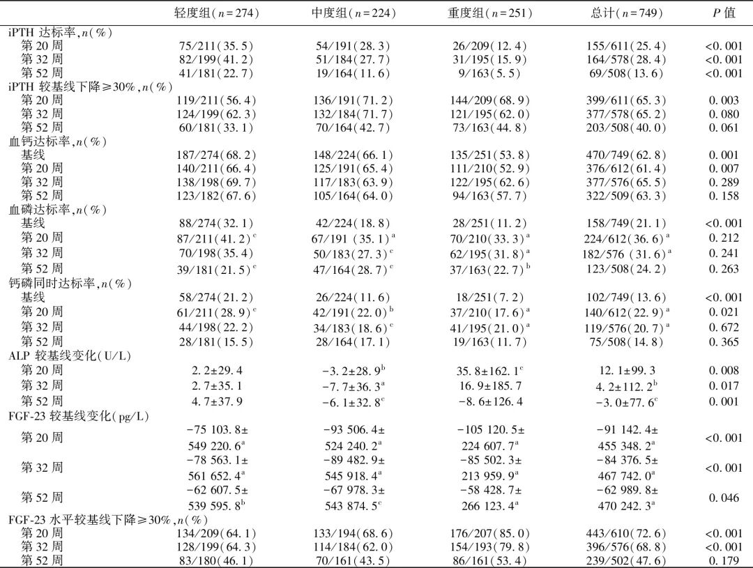 ALP:碱性磷酸酶;FGF-23:成纤维细胞生长因子23;iPTH:全段甲状旁腺激素;与基线相比,a:P<0.001,b:P<0.01,c:P<0.05