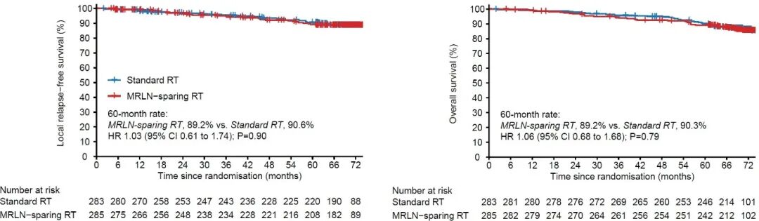 自2017年11月至2018年12月,研究共纳入568例鼻咽癌患者,其中内侧组咽后淋巴结区豁免放疗组285例,标准放疗组283例。中位随访达70个月时,内侧组咽后淋巴结区豁免放疗组与标准放疗组的5年无局部复发生存率(89.2% 对比 90.6%,分层风险比1.03;P=0.90)和总生存率(89.2% 对比 90.3,分层风险比1.06;P=0.79)均相当。