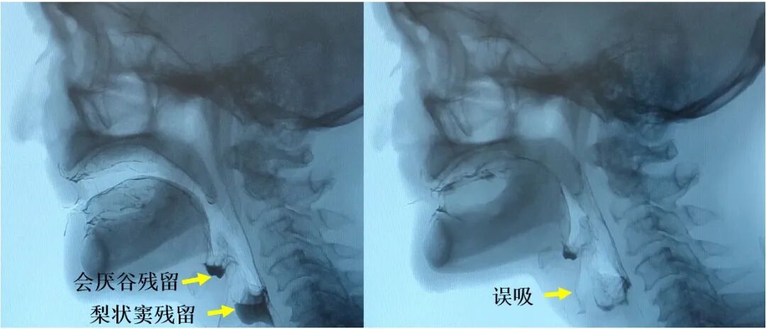图4:造影检查所示会厌谷残留、梨状窦残留及误吸