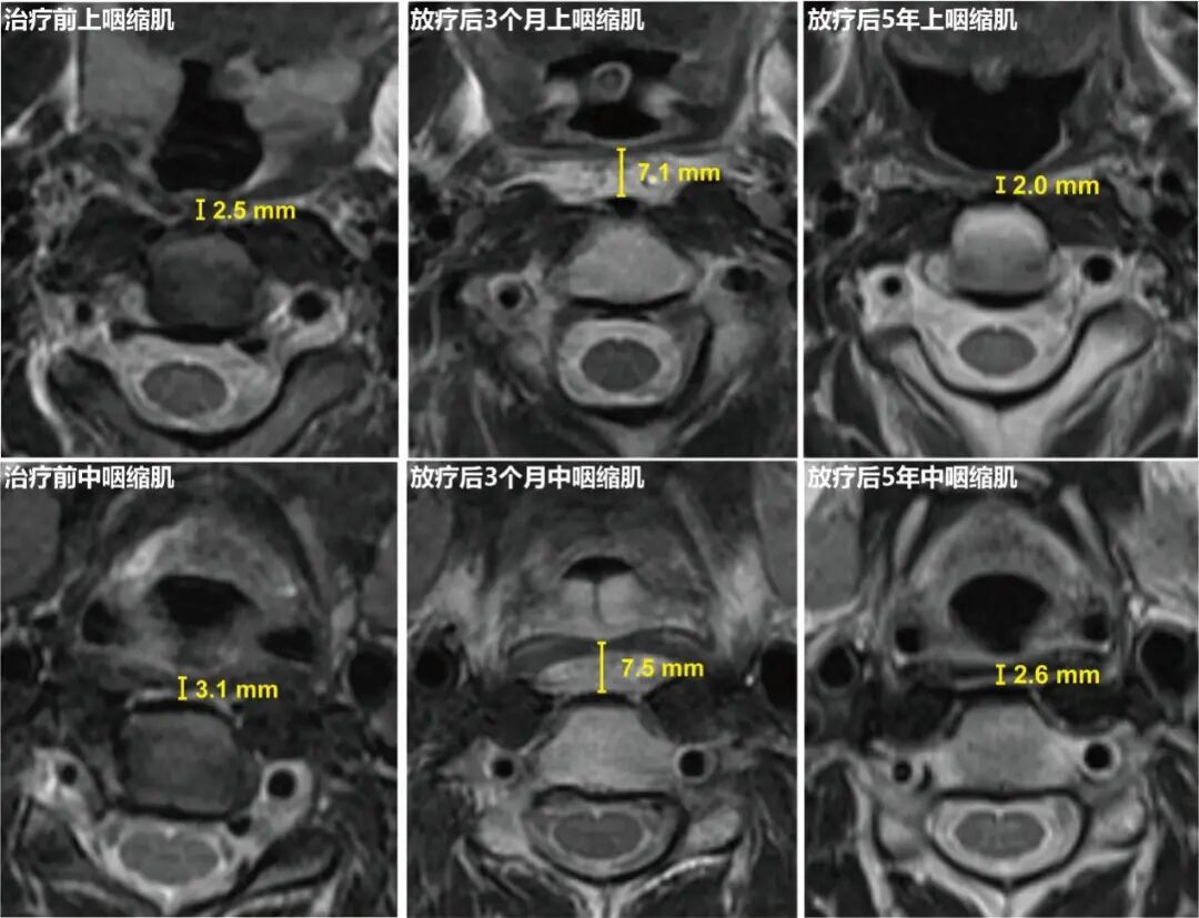 图3:治疗前、放疗后3个月及放疗后5年的上咽缩肌和中咽缩肌厚度