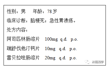 患者为78岁老年男性,合并急性胃溃疡,使用阿司匹林进行二级预防,其导致消化道出血的风险大大增加。有研究报道,既往有消化道疾病病史的患者使用阿司匹林出现消化道损伤的风险明显增加,发生过消化性溃疡出血的患者其风险增加13倍。阿司匹林肠溶片说明书【禁忌】项下注明急性胃肠道溃疡或出血体质患者禁用,该患者诊断为急性胃溃疡,应避免使用阿司匹林。