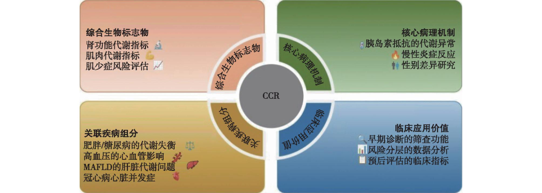 小结:MetS发病率逐年攀升,已成为全球公共卫生的重要挑战。作为评估骨骼肌质量的可靠指标,CCR在MetS及其并发症中的早期诊断、预后评估及个性化干预中的作用中展现独特价值。CCR不仅能够综合反映肌肉代谢与肾功能状态,还可通过性别差异为MetS的个性化评估提供依据,此外,CCR与IR、慢性炎症等病理机制的交互作用提示其为代谢紊乱动态监测指标的潜力,未来亟需进行更大规模的流行病学调查及大型临床研究,以阐析CCR在评估MetS预测及诊断预后中的重要作用价值,更全面地搭建MetS预测模型,可经济、有效地开展风险评估,为降低MetS风险、改善患者预后提供科学依据。