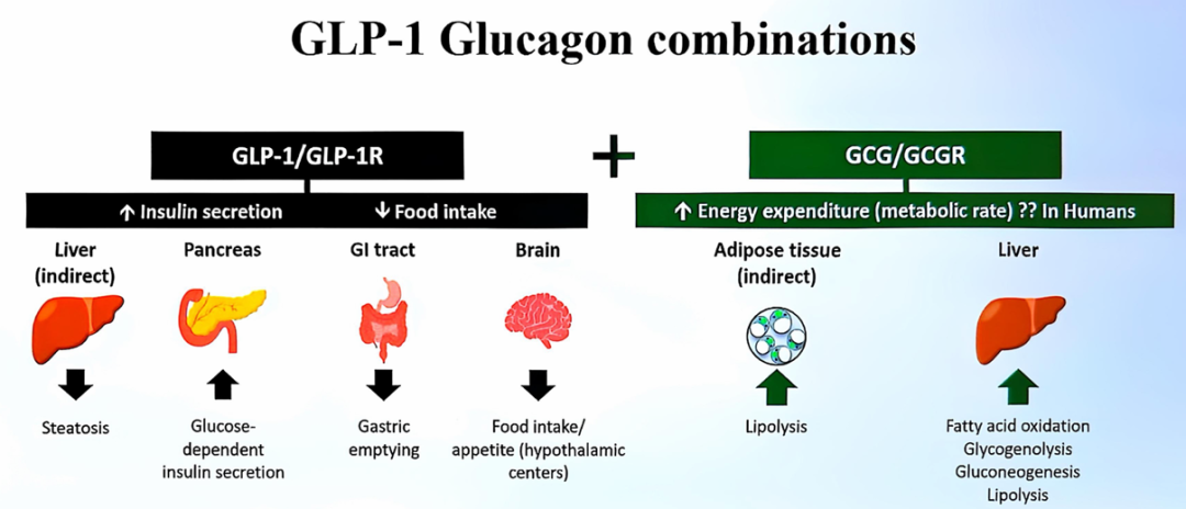 图4. GLP-1和GCG联合治疗的相关机制(图引自讲者摘要或幻灯)