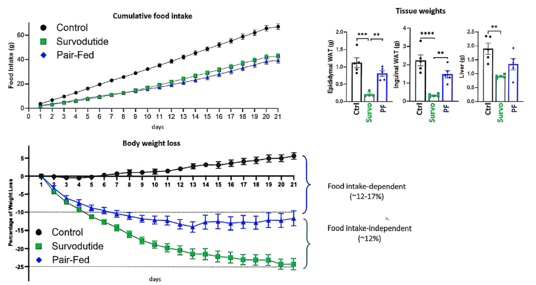 图8. Survodutide对肥胖小鼠体重及脂肪组织重量的影响(图引自讲者摘要或幻灯)