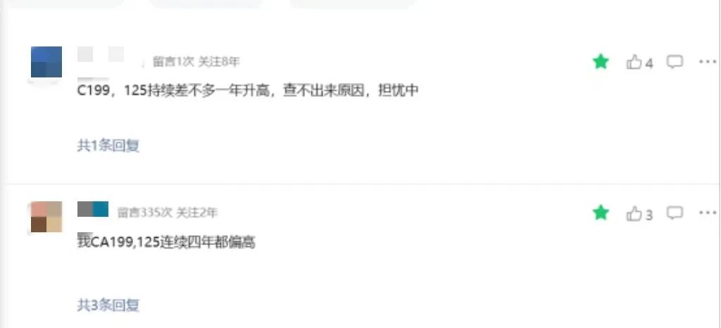 浙大一院健康管理中心胡睿主治医师表示:像上文那两个粉丝提出糖类抗原199(CA199)、糖类抗原125(CA125)持续一年或四年偏高。这两项肿瘤标志物,在女性体检中出现增高的情况不在少数,其中很多是生理性的变化,例如经期子宫内膜脱落,脱落下的子宫内膜里含有的 CA199 、CA125通过血管的断端进入血液,这种情况只需避开经期复查看是否回落即可。