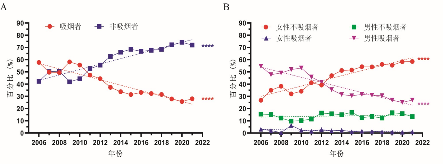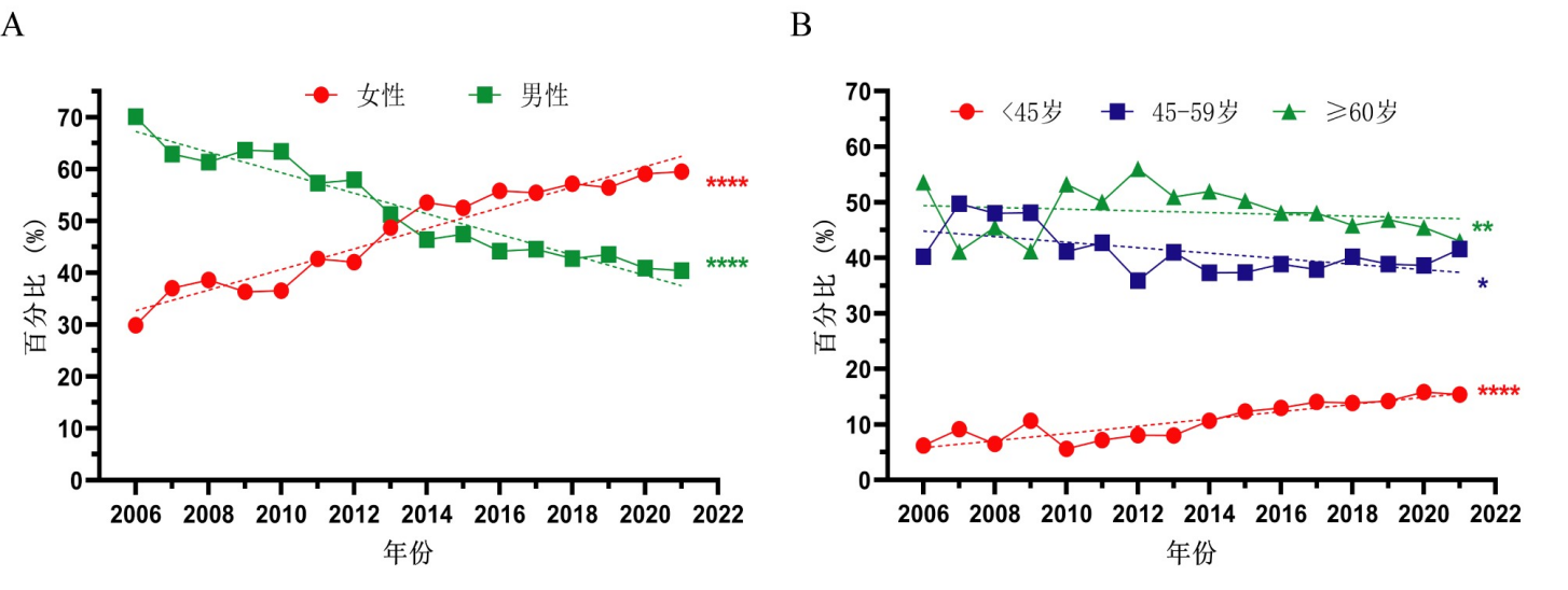 女性患者占比从2006年的29.9%持续上升至2021年的59.5%,超过男性,颠覆了传统认知中肺癌以男性为主的观念。“不吸烟”成为新常态。不吸烟的患者比例从42.3%大幅增至72.0%。其中,女性患者中不吸烟者的比例高达97.5%。此外,年轻患者,尤其是年轻女性增多。小于45岁的年轻患者比例从6.2%上升至15.4%。特别值得关注的是,年轻女性患者的比例从3.4%激增至19.2%,增幅远超男性。这提示对年轻、不吸烟女性的肺癌风险需给予高度重视。