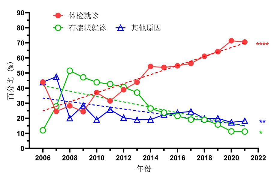 最大的积极变化之一是早期诊断率大幅提升。确诊时为0-I期的患者比例从37.1%跃升至85.0%,意味着超过八成的患者可在早期获得根治性手术机会。这一成果与健康体检意识的增强直接相关。因体检发现肺癌的比例从44.0%上升至70.5%,早期诊断率稳步增长。
