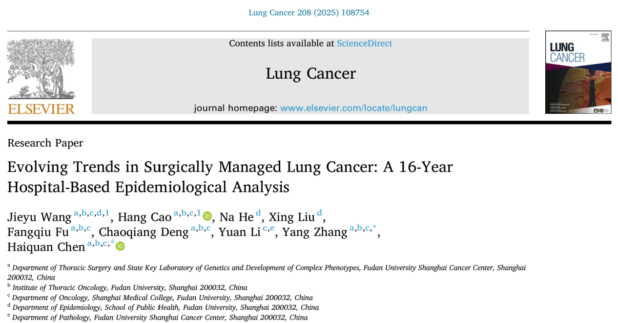 近日,复旦大学附属肿瘤医院胸外科陈海泉教授团队在国际知名肿瘤学期刊Lung Cancer上发表题为“手术治疗的肺癌的演变趋势:一项基于医院的16年流行病学分析”的重要研究成果。这项研究系统回溯了复旦大学附属肿瘤医院2006年至2021年间共21,743例接受手术治疗的肺癌患者数据,历时16年,是迄今为止国内同类研究中规模最大、时间跨度最长的研究之一。该研究首次全面揭示了中国人群可手术肺癌的疾病谱正在发生深刻变迁,为未来我国肺癌的预防、早期筛查和临床实践提供了关键的循证医学依据。