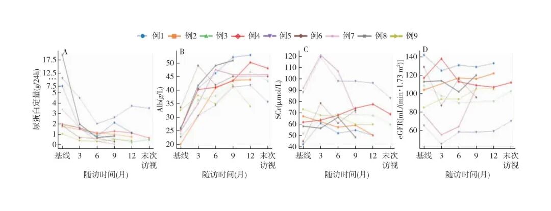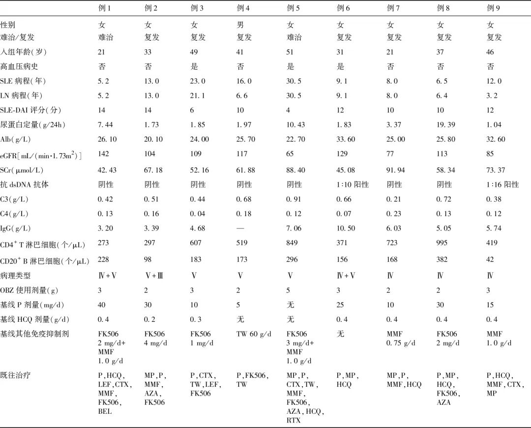 基线资料 共纳入9例患者,男性1例、女性8例,LN的起病中位年龄23岁,中位病程11.5年,其中Ⅳ型3例、Ⅴ型3例、Ⅳ+Ⅴ型2例、Ⅴ+Ⅲ型1例。复发7例,难治2例。各例患者基线情况见表1。仅例7基线接受甲泼尼龙冲击治疗。例5有糖尿病病史,基线及后续随访中未接受激素治疗。