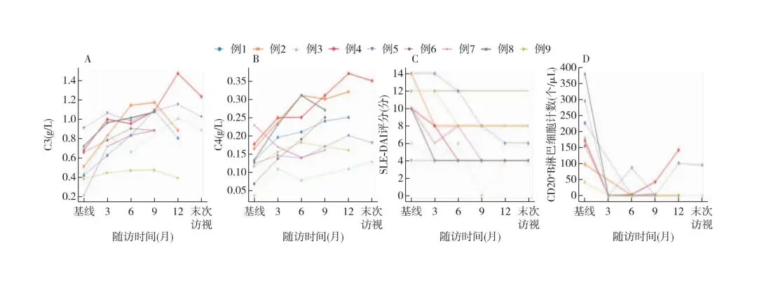 治疗期间,血清C3、C4逐渐升高。C3由基线 0.51(0.40~0.70) g/L升至第12个月的 0.95(0.70~1.23) g/L(图2A);C4则由0.13(0.09~0.17) g/L升至 0.23(0.15~0.33) g/L(图2B)。基线仅2例患者(例6和例9)抗dsDNA抗体阳性,例9在治疗期间抗体持续阳性,例6在第6个月抗体转阴;而例1在第12个月抗dsDNA抗体转为1∶16阳性。SLE-DAI评分亦呈下降趋势,由基线10.0(8.0~13.0)分降至第9个月的4.0(4.0~8.0)分(图2C)。