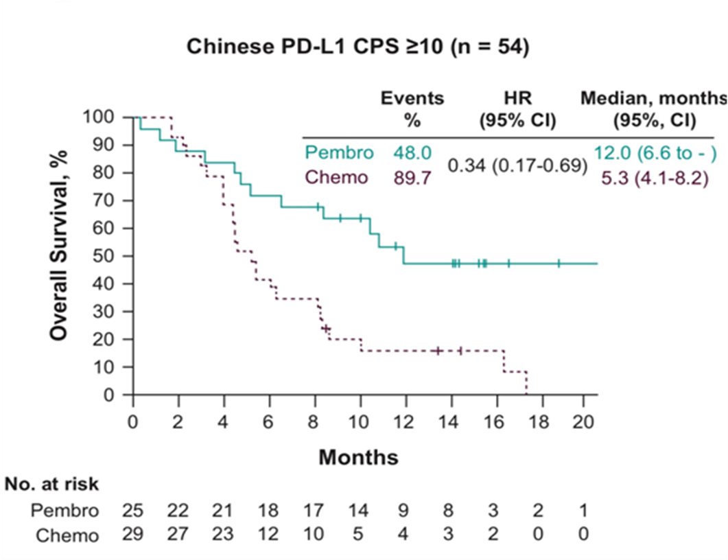 而且在PD-L1表达阳性(CPS≥10)的人群中,相比化疗方案,K药治疗中国人群的中位OS达到12.0个月, 降低死亡风险66%, 降低幅度是整体人群的2倍;在12个月时,超过一半的患者仍然存活,OS率是化疗组的3倍多,堪比一线疗效。