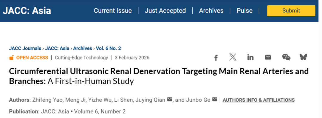 近日,国际心血管领域权威期刊《JACC: Asia》发表了一项来自中国的重要研究——复旦大学附属中山医院葛均波院士团队牵头开展的环形超声肾去神经化(uRDN)系统首个人体试验,通过靶向消融主肾动脉及分支血管神经,为难治性高血压患者提供了新的潜在干预策略。研究初步证实,该中国自研技术在安全性与降压效果上展现出积极信号。