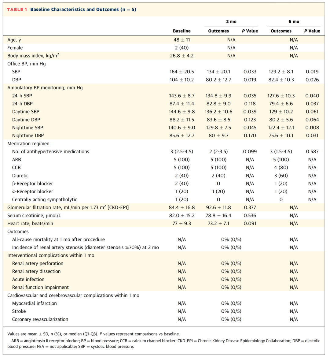 研究在中国完成,纳入5例符合标准的患者(均为中国人,年龄48±11岁,2例女性),均规律使用≥2种降压药≥6个月但血压控制不佳(诊室收缩压150~180 mmHg或舒张压≥90 mmHg,24小时动态收缩压≥135 mmHg),且排除严重肾功能不全、肾动脉狭窄等禁忌证。
