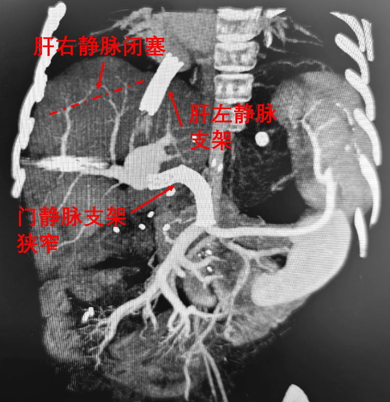 图2.患儿术前CT。肝右静脉闭塞,肝后性门静脉高压。门静脉支架重度狭窄,肝前性门静脉高压。两项门静脉高压同时存在,导致肠系膜上静脉回流肝脏受阻,肠表面渗出大量腹腔积液。