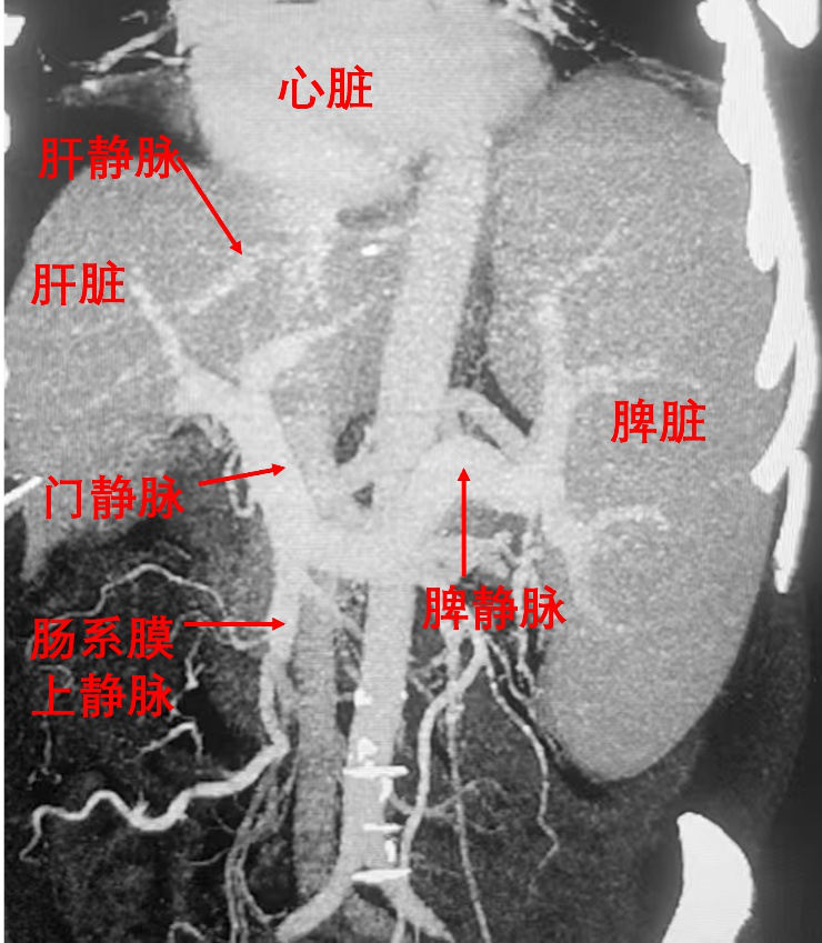 图1.正常肝脏血管解剖。肠系膜上静脉引流肠道血液至肝脏,经肝静脉回流心脏。门静脉狭窄为肝前性门静脉高压,肝静脉狭窄为肝后性门静脉高压。肝脏内病变为肝窦性门静脉高压。各种门静脉高压,导致肠系膜上静脉血液无法流回肝脏,压力升高,可引起腹腔积液、消化道出血等并发症。