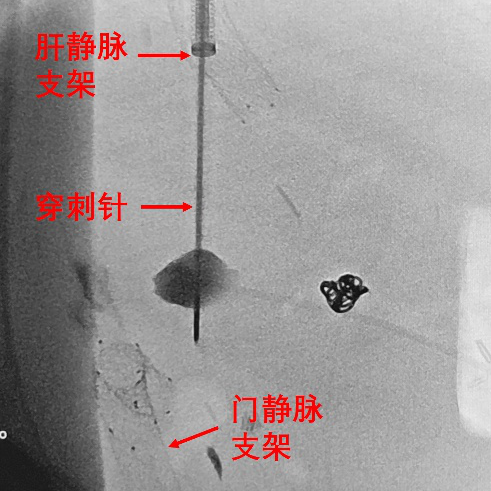 图4.经肝静脉支架穿刺门静脉成功