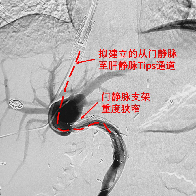 图5门静脉重度狭窄。拟建立的从门脉支架至肝静脉支架的Tips分流道