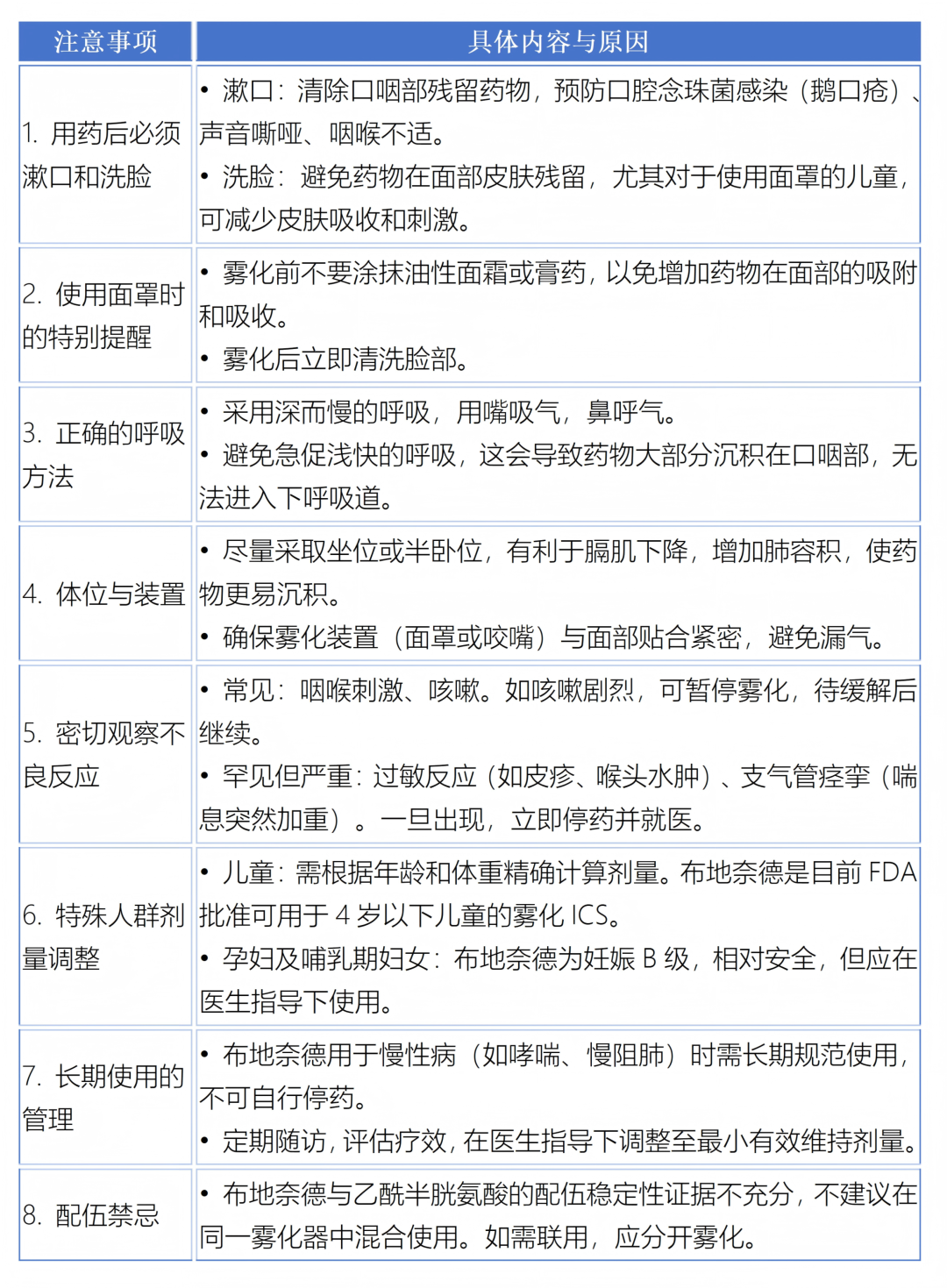 牢记“先支气管扩张剂,后布地奈德”的顺序,并严格执行“用药后漱口洗脸”的规定,是保证雾化吸入治疗安全有效的两大基石。 同时,注意正确的呼吸技巧和体位,并了解可能的不良反应,才能让雾化治疗发挥最佳效果。