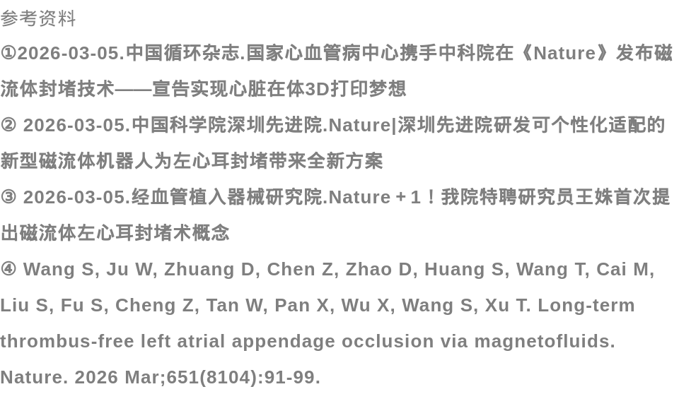 2026年3月5日,国际权威学术期刊《自然》(Nature)正式发表中国医学科学院阜外医院潘湘斌团队联合中国科学院深圳先进技术研究院徐天添团队完成的磁流体左心耳封堵术原创研究成果。