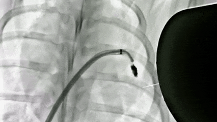 数字减影血管造影(DSA)拍摄的巴马猪体内磁流体左心耳封堵实验过程。深圳先进院供图