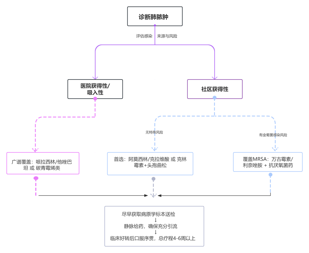 诊断肺脓肿后,初始经验性抗生素治疗的核心是覆盖厌氧菌。β-内酰胺类/酶抑制剂复方(如阿莫西林/克拉维酸)或克林霉素是社区获得性肺脓肿的经典选择。但必须根据个体风险调整,并牢记长疗程和有效引流与抗生素选择同等重要。最终治疗方案应依据病原学结果进行目标性调整。