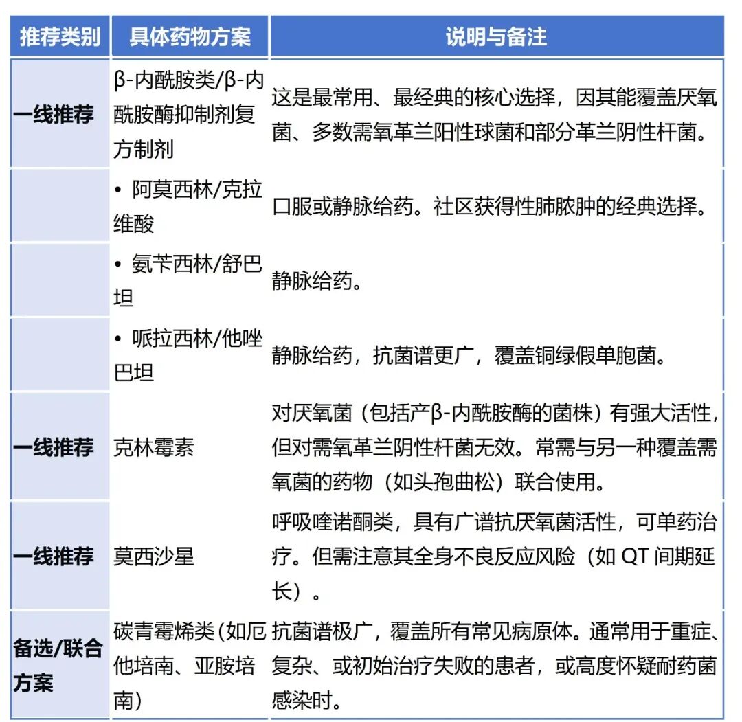 总结“首选”思路:对于无特殊耐药风险的社区获得性肺脓肿,阿莫西林/克拉维酸或克林霉素(联合头孢曲松)是经典的初始选择。莫西沙星是有效的单药替代方案。