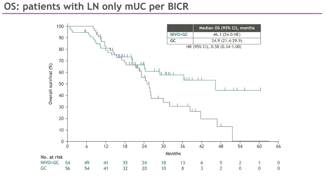 精准人群的疗效优势进一步放大[3]:CheckMate-901聚焦顺铂耐受患者这一传统化疗优势人群,在该人群中通过免疫联合策略进一步提升疗效。不仅如此,研究开创性地揭示出仅淋巴结阳性(LN+)这一重要分层:事后分析结果显示,仅LN+患者接受纳武利尤单抗+化疗的中位OS接近4年(46.3个月,HR=0.58),客观缓解率(ORR)达81.5%,完全缓解(CR)率达64.3%,提示仅LN+人群能从免疫联合化疗中进一步提升获益。