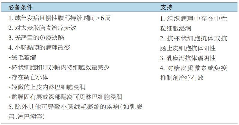 随着对成人 AIE 认识的逐渐增多,特别是 2007 年梅奥诊所基于对15例成人AIE患者的总结,提出了首个诊断标准,该标准同时考虑了患者的临床和病理特征,即① 成人持续>6周的腹泻;② 有吸收不良的表现;③ 小肠黏膜特征性的病理改变(部分或完全的小肠绒毛钝缩,深部隐窝淋巴细胞浸润,隐窝凋亡小体 增多,少量上皮内淋巴细胞增多);④ 排除其他导致小肠绒毛萎缩的疾病,如乳糜泻、普通变异型免疫缺陷病;⑤ 抗肠上皮细胞抗体和(或)抗杯状细胞抗体阳性。同时满足①~④ 条标准即可以诊断,抗体阳性更加支持诊断,但抗体阴性也不能除外诊断。