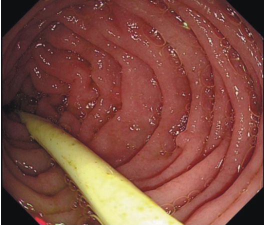 胃镜 复查胃镜可见十二指肠球、降部黏膜肿胀,小肠绒毛变短,偶见扇贝样改变(图1)。