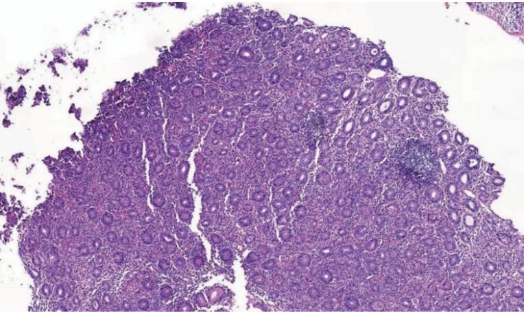 图2 十二指肠降部黏膜活检病理结果:小肠(十二指肠)绒毛重度萎缩,杯状细胞减少(10×)