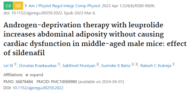 动物实验支持了ADT样肥胖和动脉粥样硬化是心血管疾病风险增加的因素,使用GnRH激动剂亮丙瑞林治疗的成年小鼠,腹部重量显著增加,肌钙蛋白增加,但总体重没有变化。