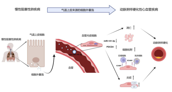 2026年2月6日,北京大学第三医院呼吸与危重医学科孙永昌教授团队在《纳米生物技术杂志》(Journal of Nanobiotechnology,影响因子12.6)在线发表了题为《慢阻肺气道上皮细胞来源细胞外囊泡通过miR-141-3p/PDCD4轴促进内皮功能障碍及动脉粥样硬化》的研究论文(COPD airway epithelial cells–derived extracellular vesicles contribute to endothelial dysfunction and atherosclerosis via the miR-141-3p/PDCD4 axis) ,揭示了慢性阻塞性肺疾病(慢阻肺、COPD)与动脉粥样硬化之间的潜在联系,为认识慢阻肺促进心血管疾病发生发展的机制提供了重要理论依据。