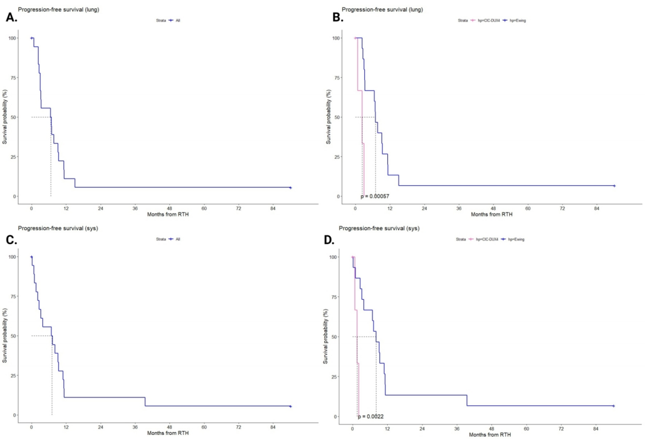 全肺照射(WLI)在儿童Ewing肺转移的综合治疗中更常用,通常在化疗后肺转移达到影像学缓解/切除后作为巩固,在成人中的证据相对缺乏。该研究回顾分析了19例成人小圆细胞肉瘤肺转移全肺照射后的数据发现,⓵肺局部疗效:肺部局部ORR为78.9%,提示WLI对肺内病灶确实“能压下去”;⓶ 肺局部无进展:中位p-PFS期为6.7个月;⓷全身无进展: 中位s-PFS期为7.1个月;⓸OS期:中位OS期为73个月。且CIC-DUX4从WLI获益显著更差,提示这类亚型更需要系统治疗突破,单靠局部治疗很难改善预后。但该研究缺少未接受WLI的对照组,因此不能直接证明WLI提高OS,只能说明在被选中的成人患者里,WLI可实现较高肺部ORR且毒性可管理。