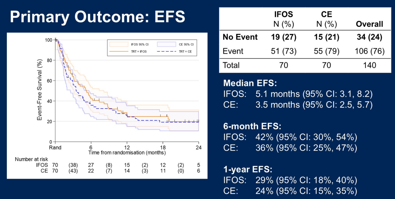 由欧洲尤文肉瘤协作组主导的rEECur是一个国际多中心、随机对照、多臂Ⅱ期临床试验,旨在评估对比卡铂+依托泊苷(CE)与高剂量异环磷酰胺(HD-IFO)的在复发或原发难治性尤文肉瘤中的疗效。CE组用药方案为:Carboplatin 400 mg/m² d1 + Etoposide 120 mg/m² d1-3 (q3w)。HD-IFO组用药方案为:Ifosfamide 15 g/m²连续5天(q3w)。试验结果表明,在中位EFS期上,HD-IFO组为5.1个月;CE组为3.5 个月,验后概率上,IFOS优于CE的概率为87%;6个月EFS率上,IFOS约为44%,CE约为36%,提示HD-IFO仍是控制疾病的更优方案。