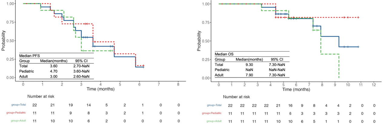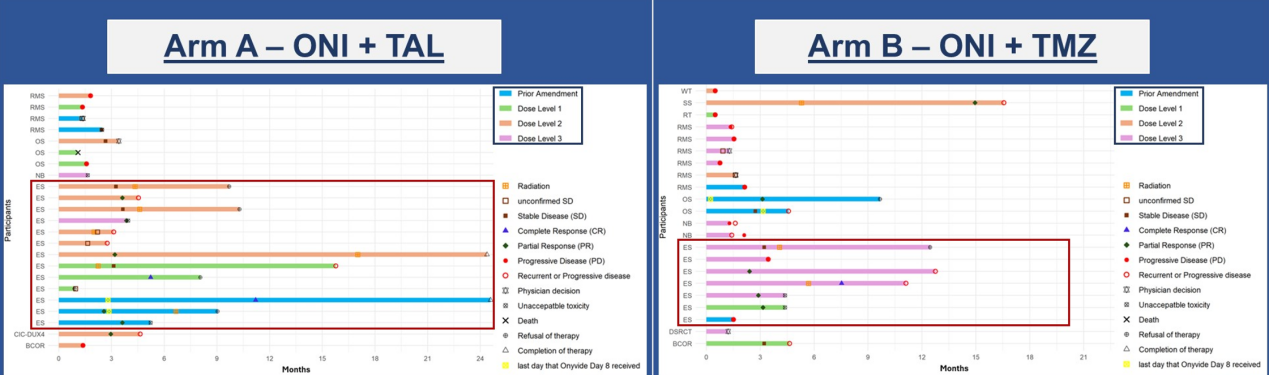 在可评估患者中:Arm A的PR为10%~15%,DCR为50%;Arm B:PR为20%~25%,DCR约60%。Onivyde+TMZ 的疗效略优,毒性更可控,被建议优先进入Ⅱ期扩展。